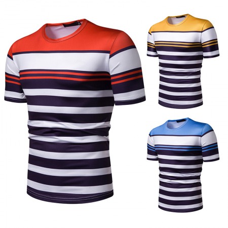 New Summer Men's Short-Sleeved T-Shirt Mens Contrast Striped Slim Casual T-Shirt